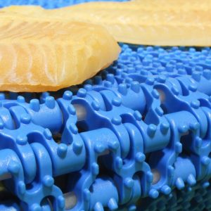 The equipment of this belt is completed by no-cling flights, so that this belt is the best option for glazing fish or processing of very light product sprayed by water.